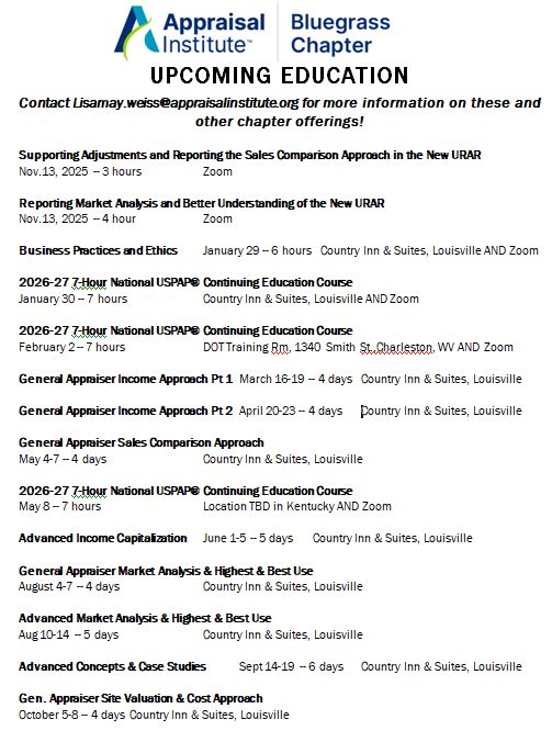 Turn to the Bluegrass Chapter for all your real estate appraisal education needs!