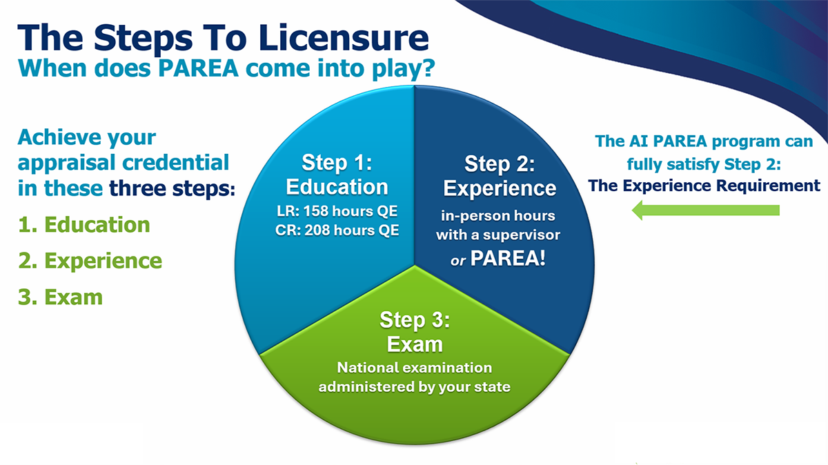 The Appraisal Institute Practical Applications of Real Estate Appraisal (AI PAREA) is an alternative to the traditional supervisor and trainee requirement for experience for the Licensed Residential Real Property Appraiser (LR) and Certified Residential Real Property Appraiser (CR) credentials. It’s an online program providing simulations that show participants how to apply appraisal theory and methodology to real-world examples, with mentoring and guidance from appraisers who hold the most recognized designations in the profession and have a combined 150 years of experience.