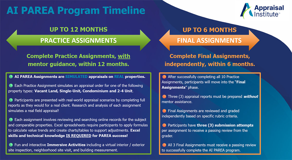 Participants who successfully complete an AI PAREA program receive both experience credit and timeline credit as defined by the Appraiser Qualifications Board (AQB). Credits vary based on the program completed.